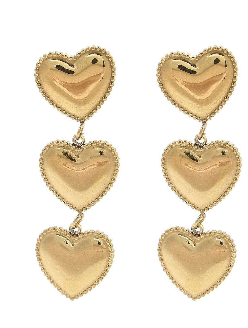 Caravanas colgantes en acero dorado, con tres corazones, perfectas para destacar con sutileza.