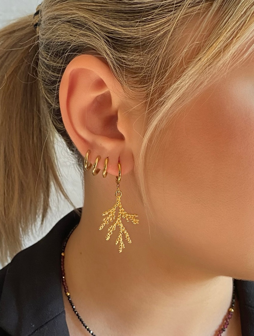 Aritos con dije en forma de raíz, ideales para completar cualquier look.