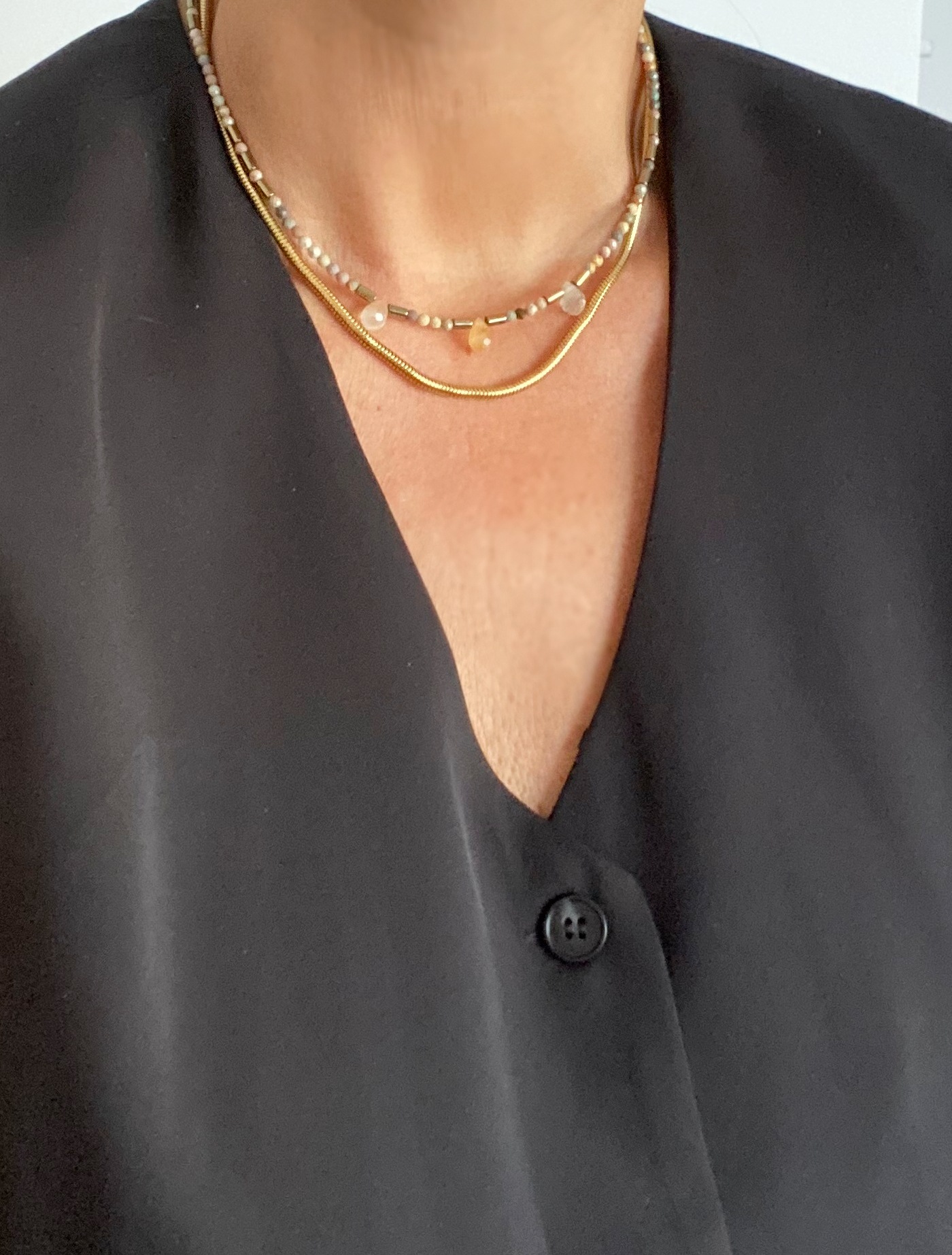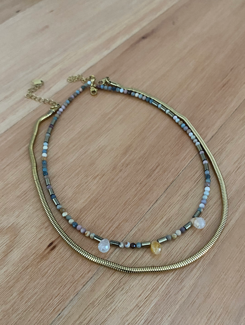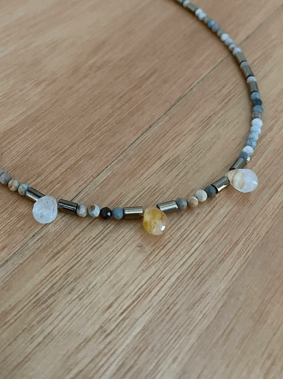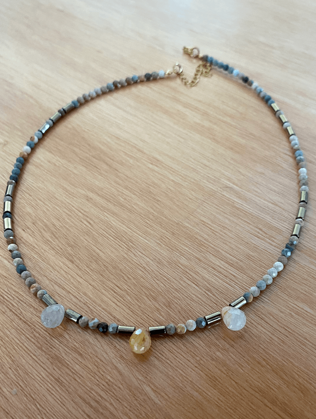 Collar hecho a mano con cuentas de piedra natural ágata en la gama de los beige, combinado con cuentas tubo de hematita dorada, y 3 dijes tipo gota de piedra natural citrino. Cierre en acero dorado.