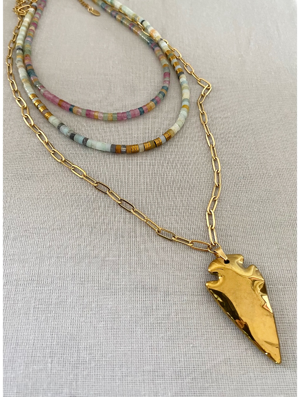 Un diseño moderno y con carácter. Este colgante combina una cadena de acero con eslabones tipo clip, con un dije en forma de flecha de hematita sintética. Ideal para quienes buscan un accesorio versátil, con un toque urbano y sofisticado. Disponible en dorado y plateado.