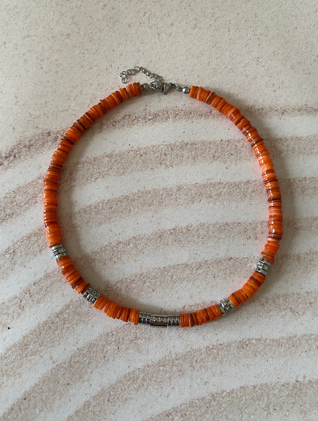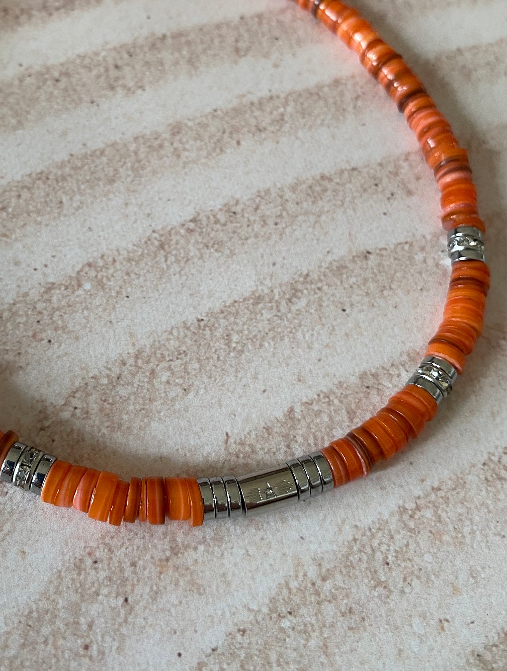 Collar hecho a mano con cuentas tipo disco en nácar teñido de naranja, combinado con cuentas de hematita plateada, cuentas en acero y cristal y dije en forma de cilindro en acero plateado. Diseño único!