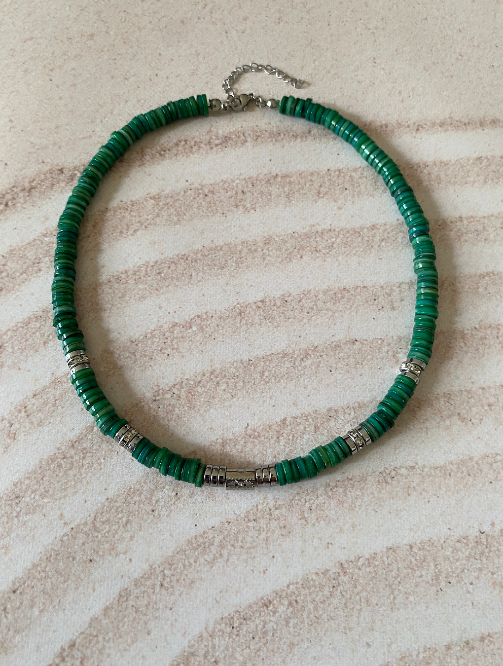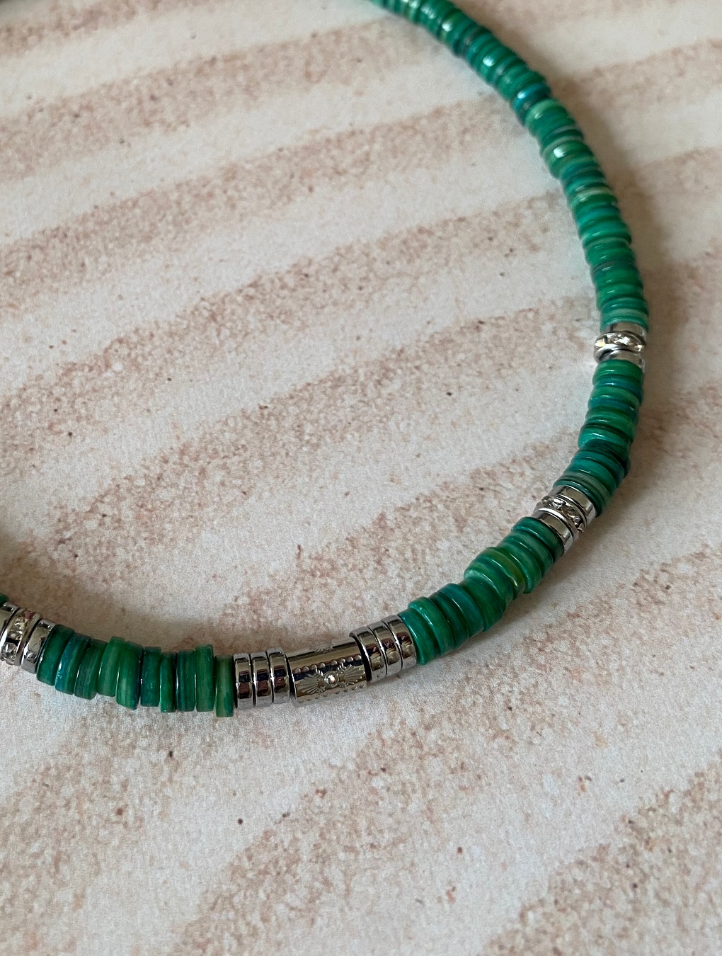 Collar hecho a mano con cuentas tipo disco en nácar teñido de verde, combinado con cuentas de hematita plateada, cuentas en acero y cristal y dije en forma de cilindro en acero plateado. Diseño único!
