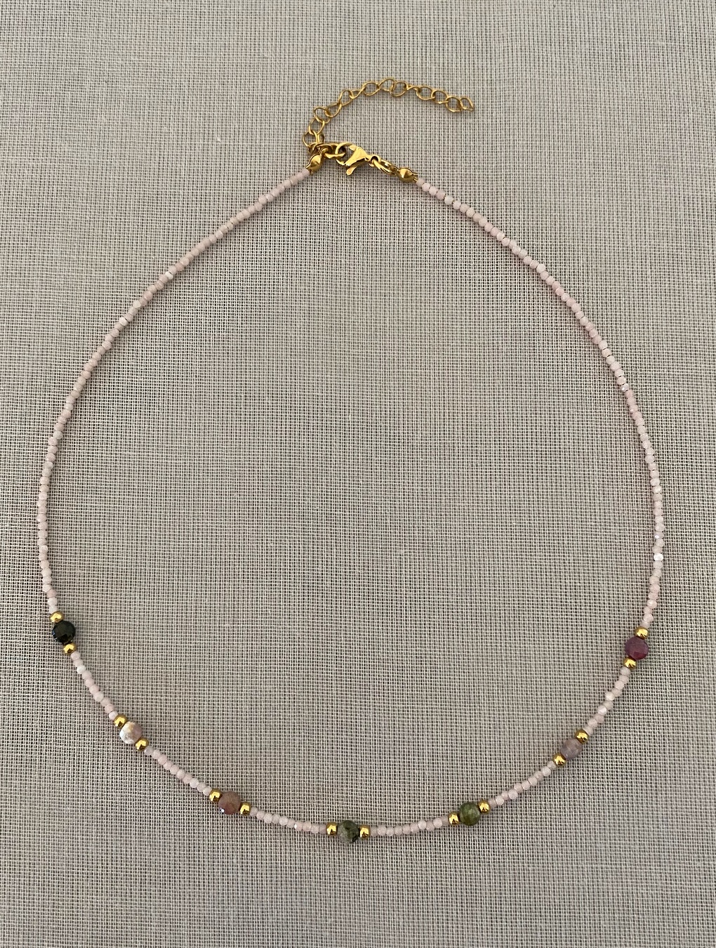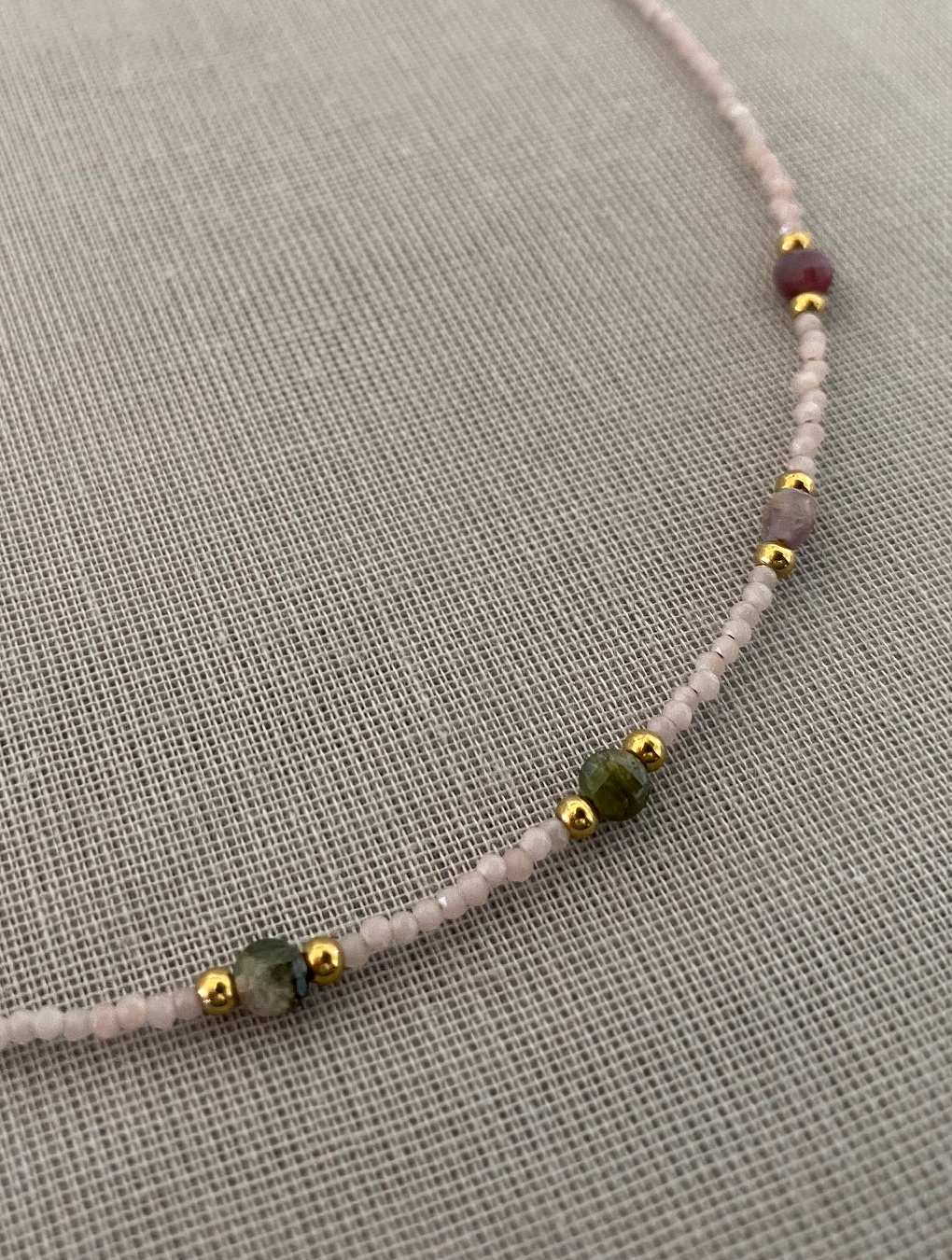 Delicado collar hecho a mano con cuentitas de ópalo rosa, combinado con cuentas de acero dorado y cuentas de piedra natural turmalina.