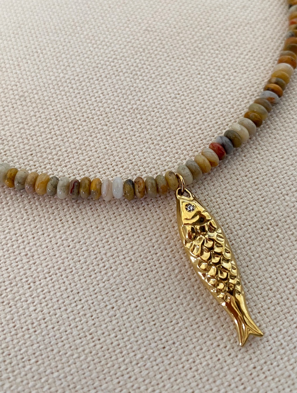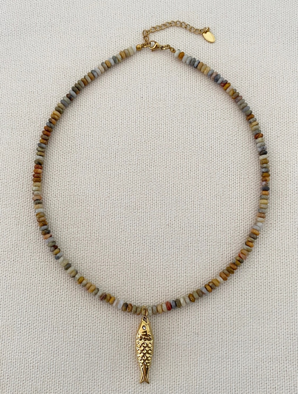 Collar hecho a mano con cuentas de piedra natural ágata en corte rondelle en tonos de beige, marfil, tierra, cobre... combinado con un dije en forma de pez en acero dorado.