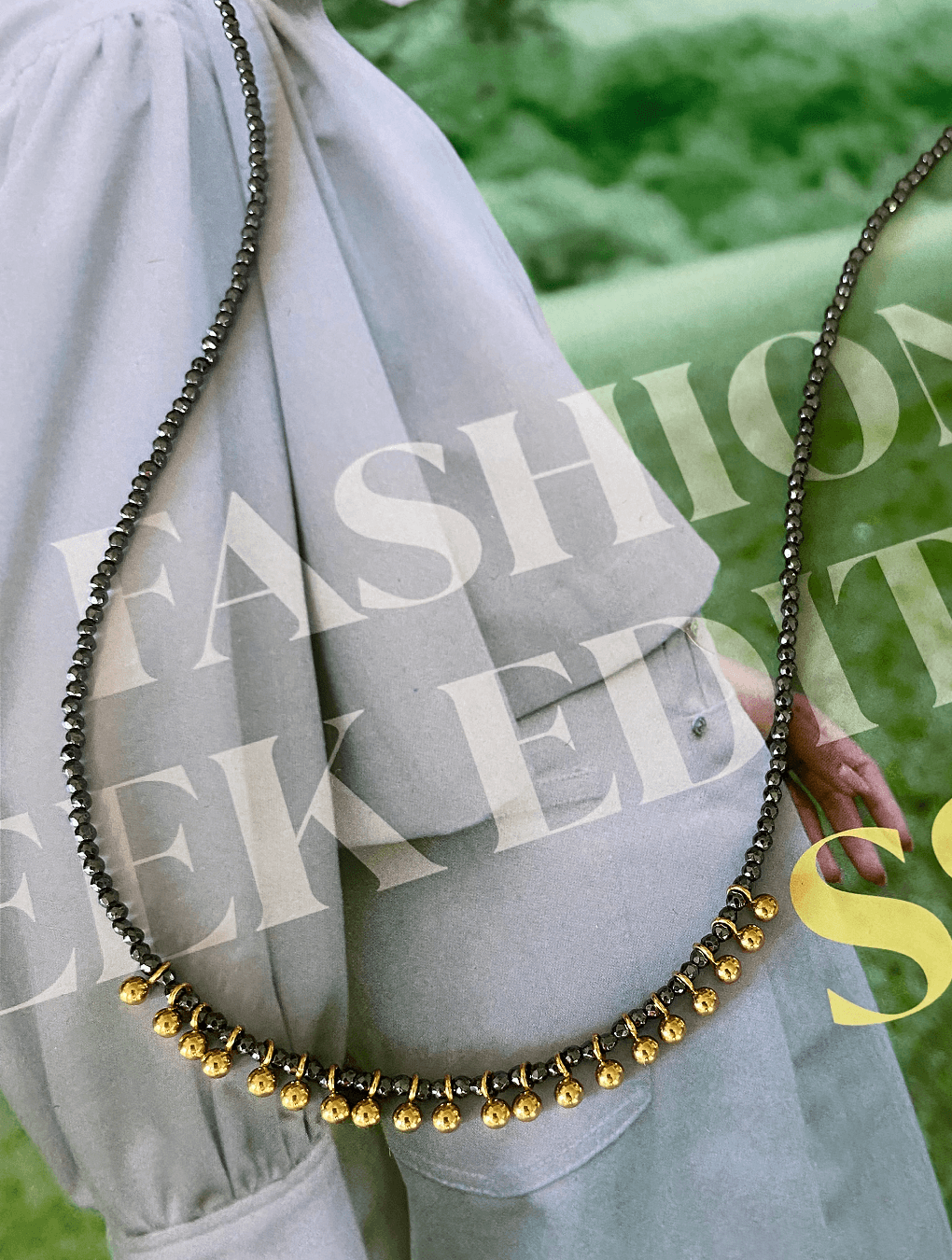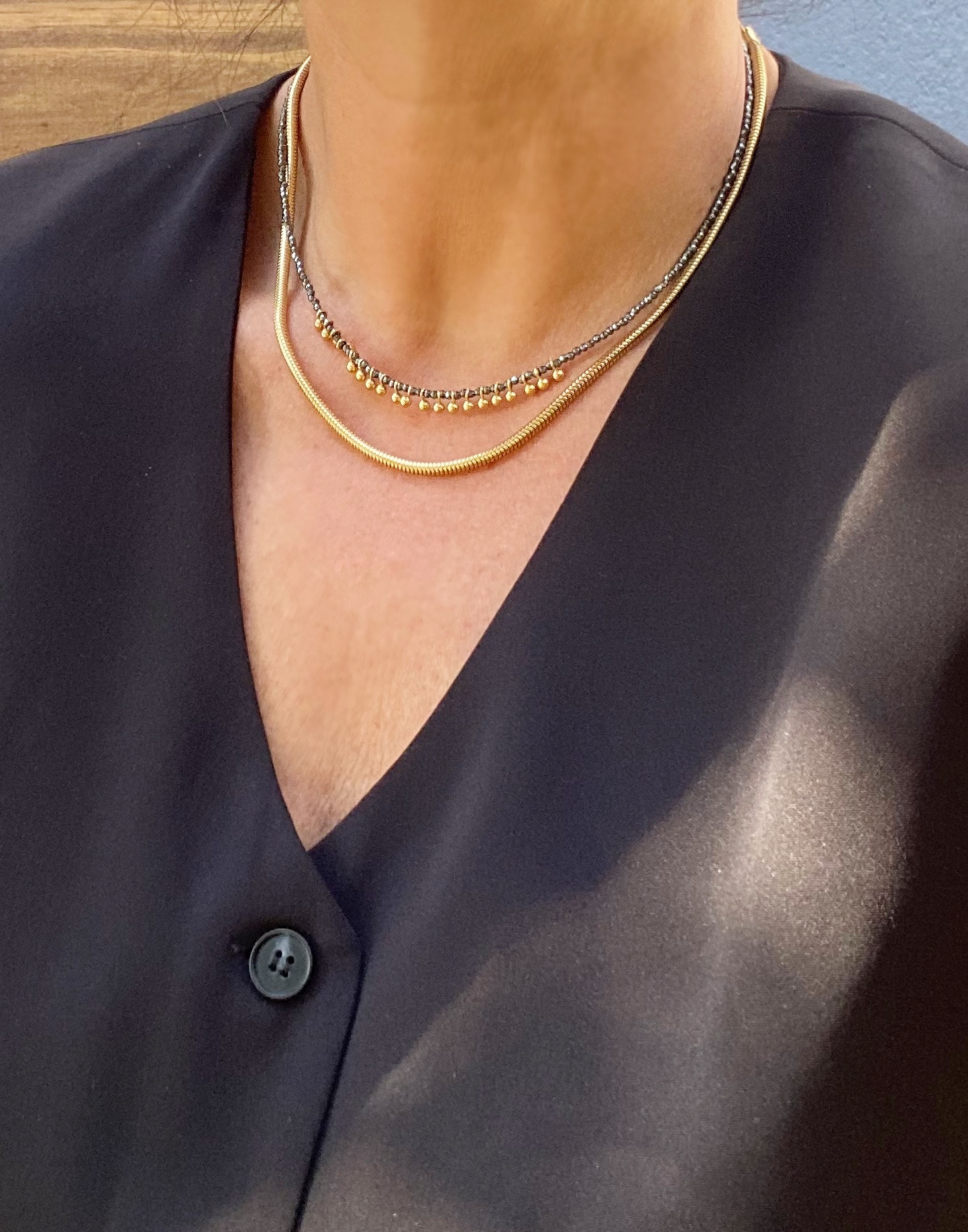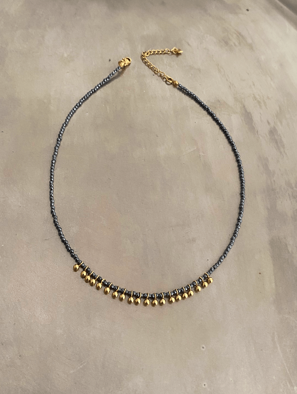 Collar hecho a mano con cuentas de hematita gris, combinadas con cuentas colgantes de acero dorado, cierre en acero dorado.