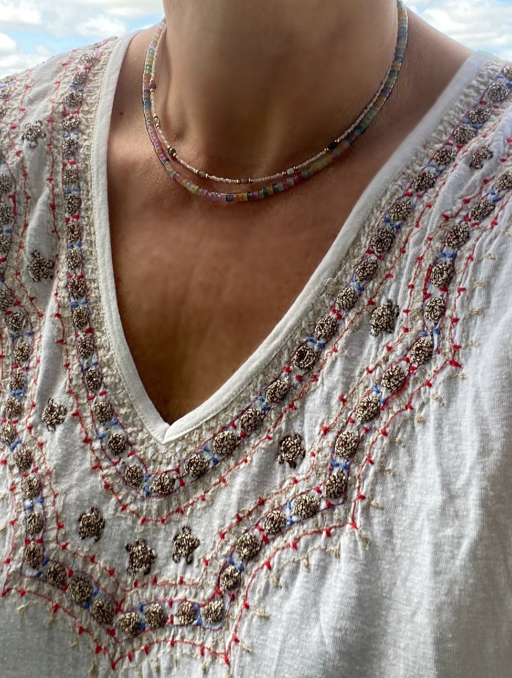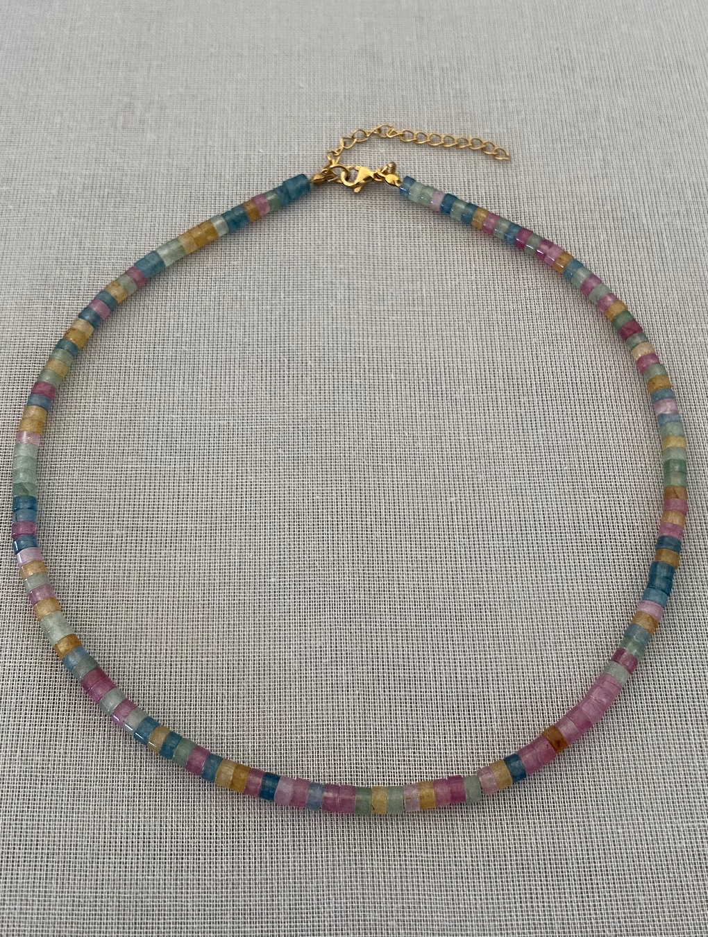 Collar hecho a mano con cuentas de piedra natural corte disco de jade teñido en tonos pastel. Una pieza muy versátil, ideal para usar todos los días.