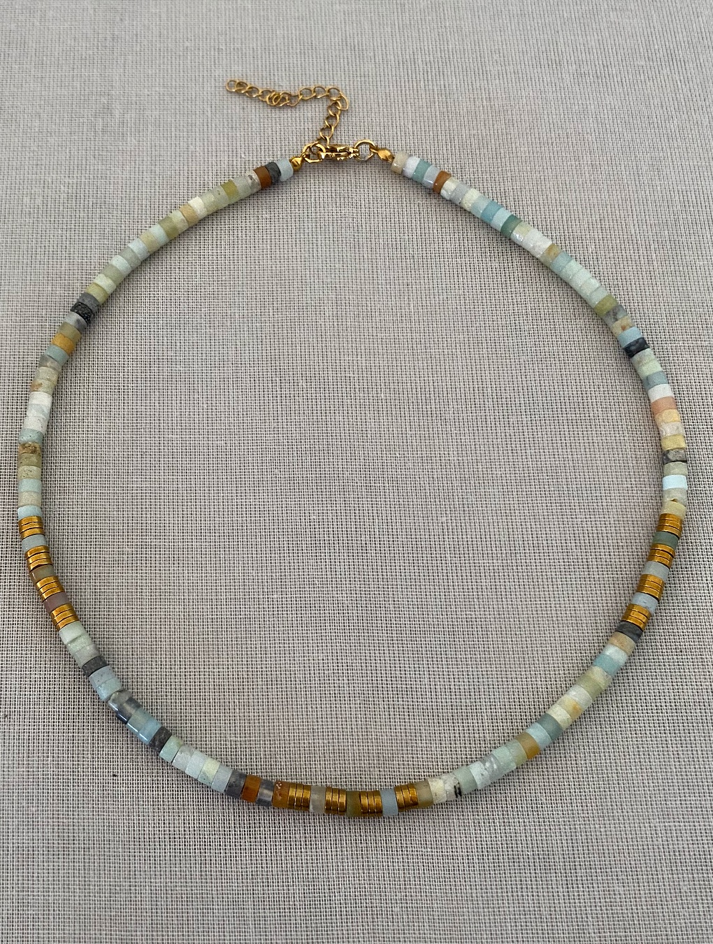 Collar súper versátil, ideal para todos los días y combinar con otros collares. Es hecho a mano, con cuentas de piedra natural amazonita y cuentas de hematita sintética. El cierre es en acero dorado.
