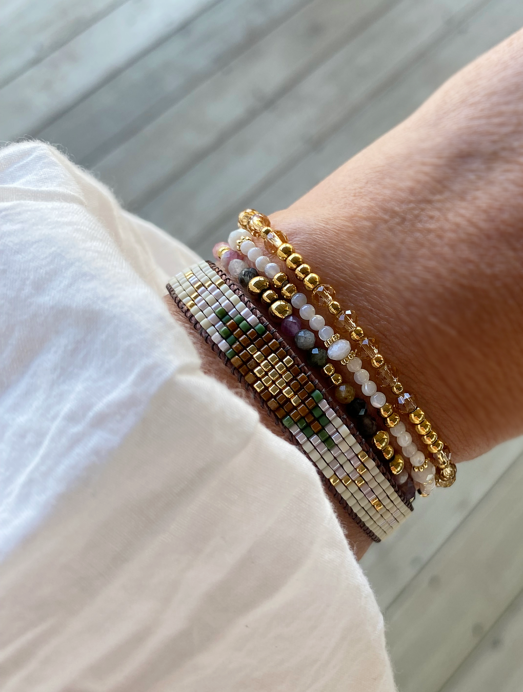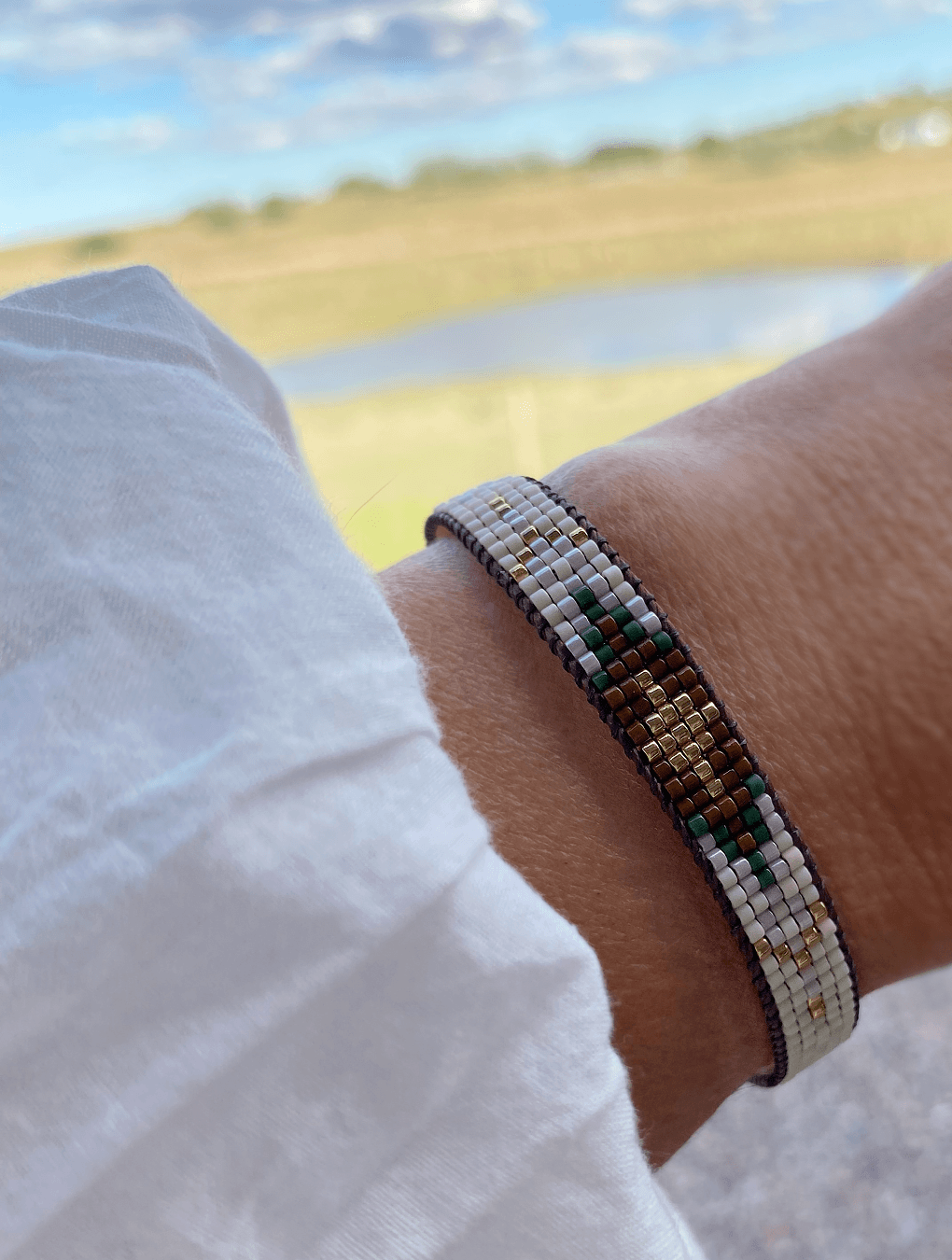Pulsera tejida con cuentas originales Miyuki, diseño único en tonos de beige, marrón y dorado entre otros. Ajustable con cordón marrón.