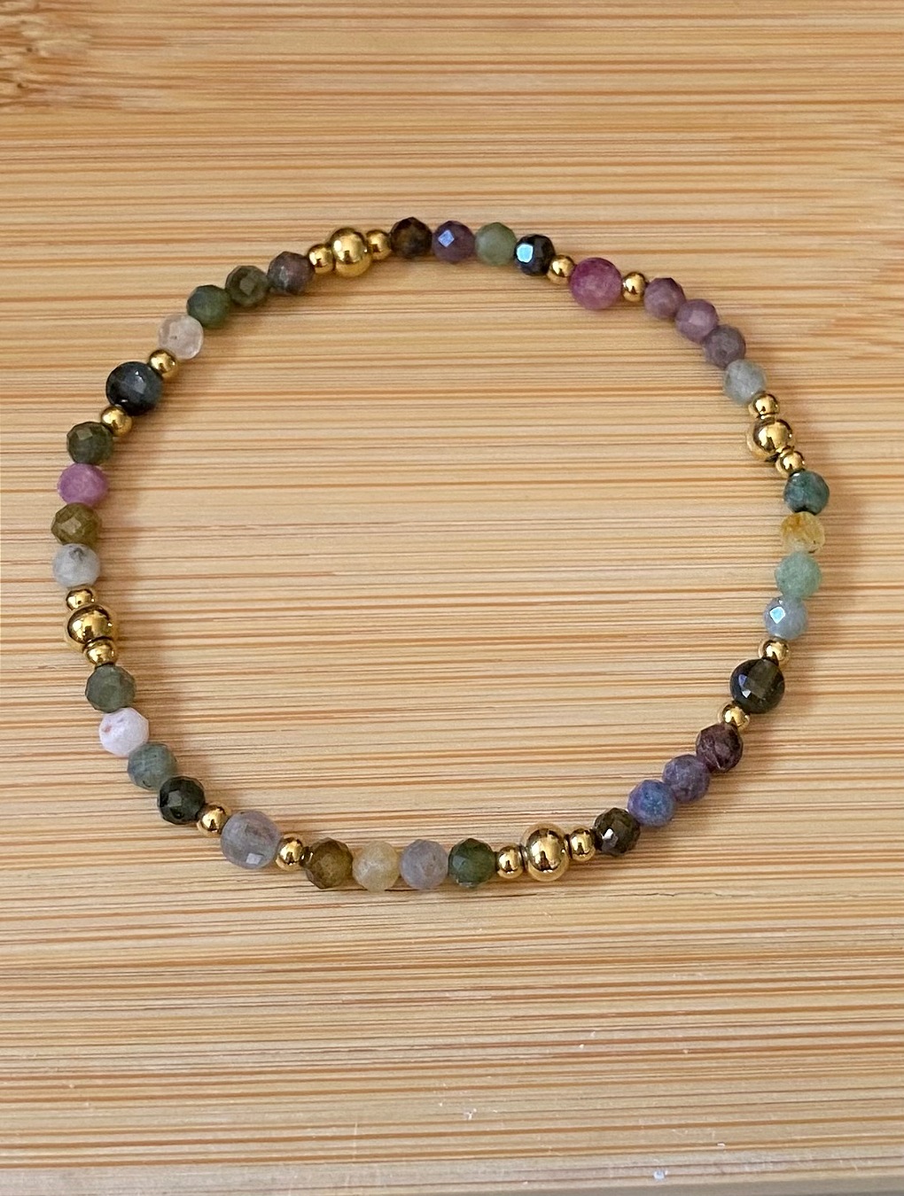 Pulsera elástica hecha a mano con cuentas de piedra natural turmalina y cuentas de acero dorado.