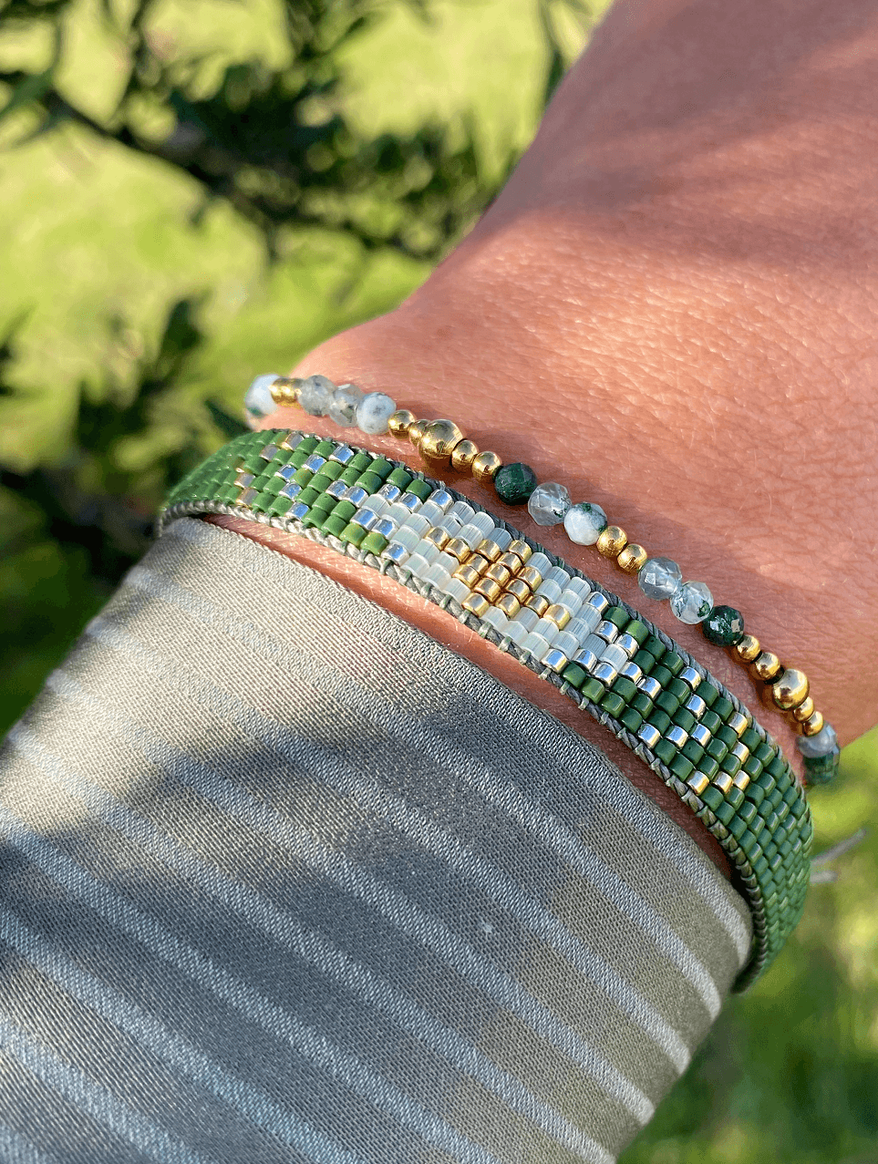 Pulsera tejida con cuentas originales Miyuki en tonos de verde, dorado y plateado. Ajustable con cordón verde.