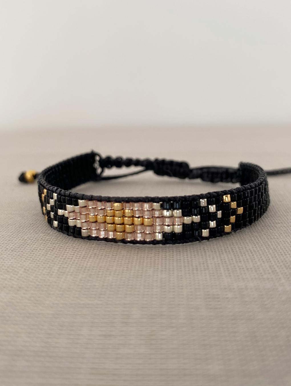 Pulsera tejida con cuentas originales Miyuki con base negro y diseño en tonos de dorado, plateado y champagne.