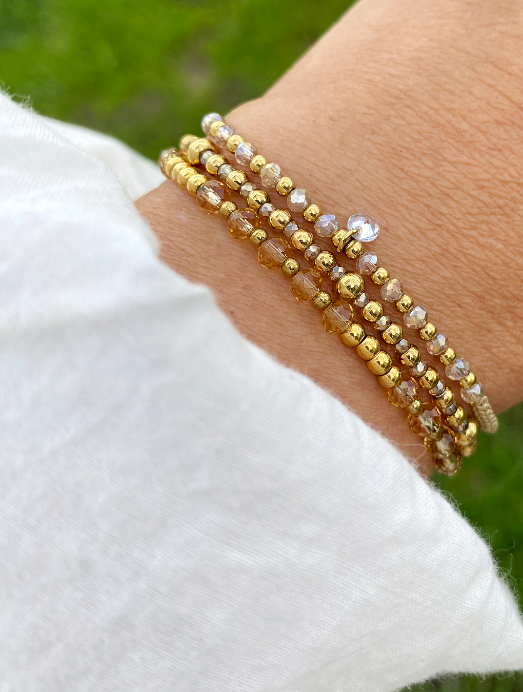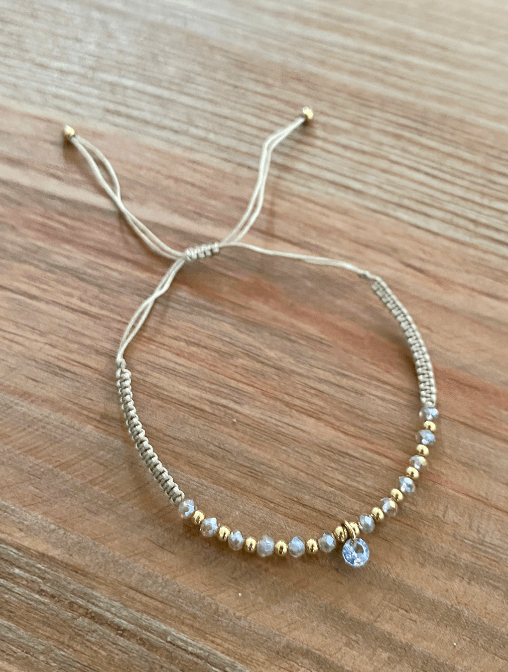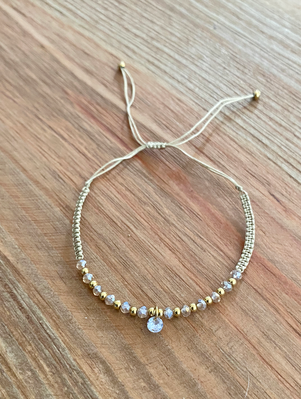 Pulsera tejida con cordón beige con detalle de cuentas en acero dorado combinadas con cuentas de cristal color champagne y dije cristal tipo punto de luz.