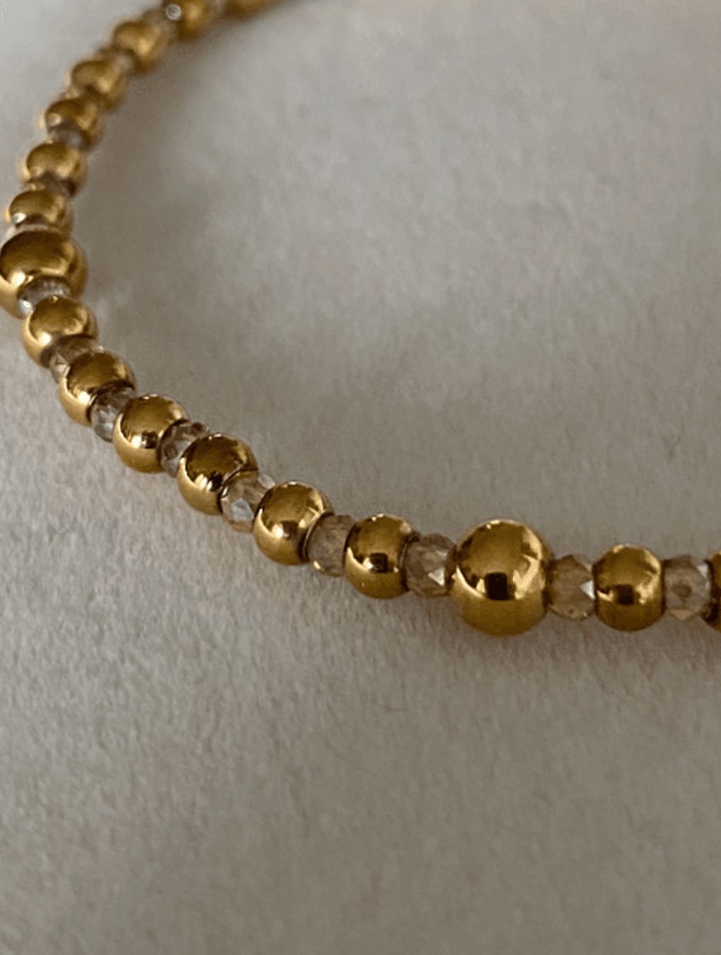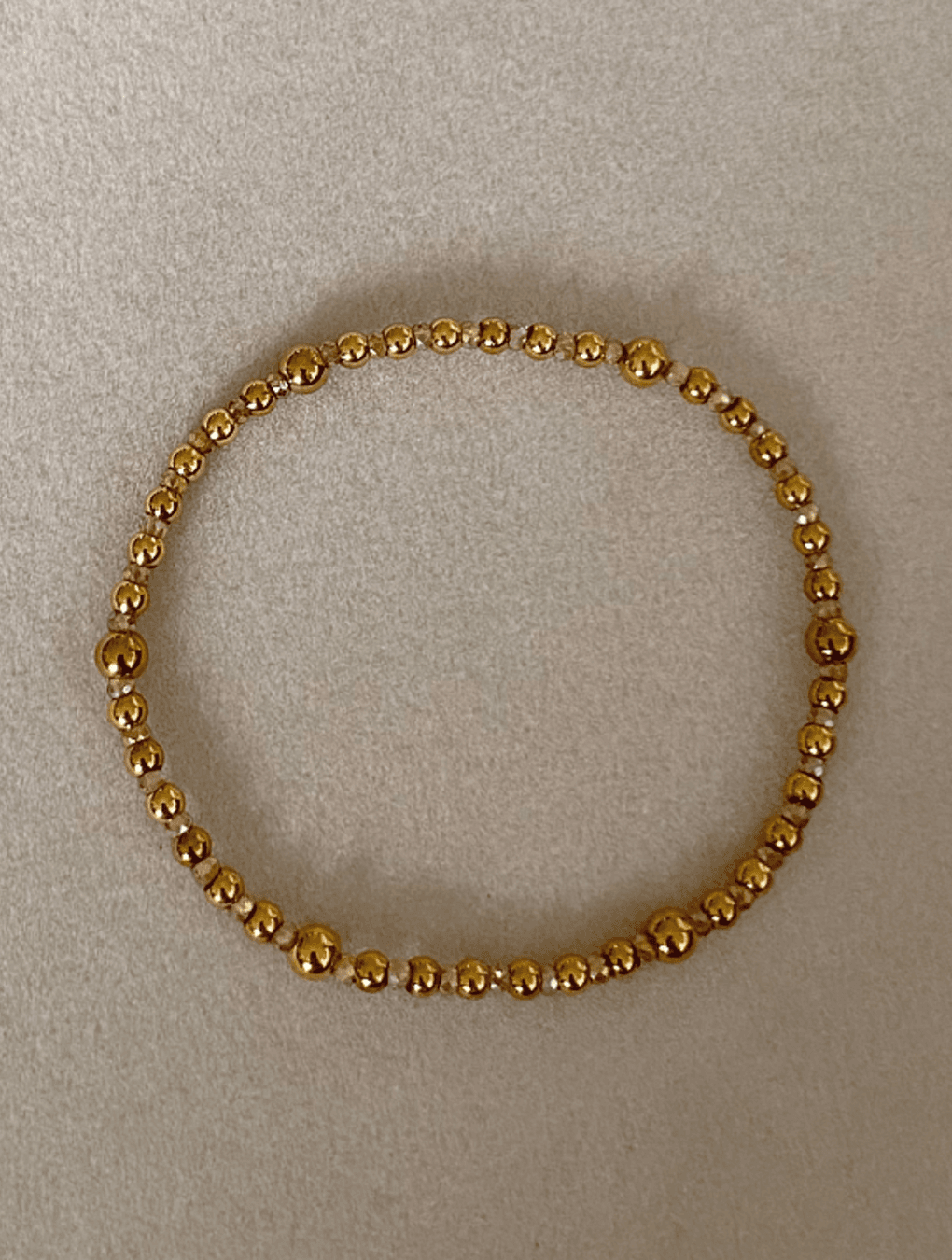 Pulsera elástica con cuentas de acero dorado, combinada con cuentas de cristal color champagne.